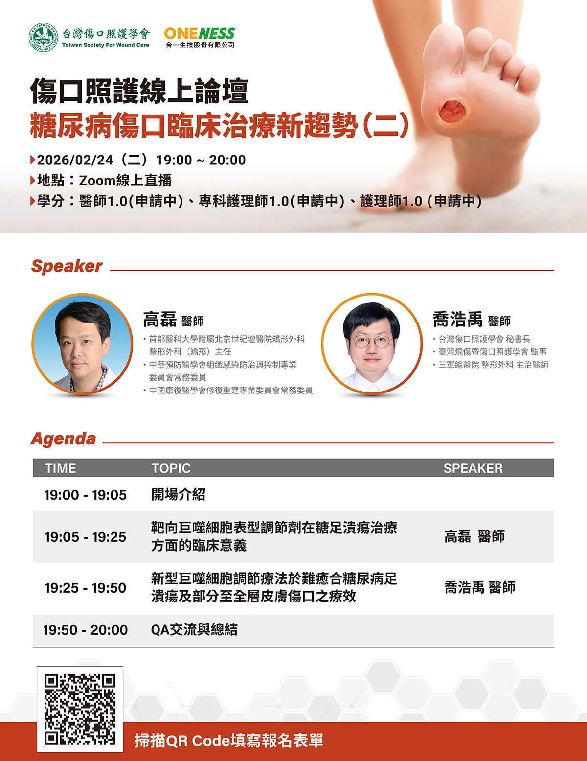 本次「傷口照護線上論壇:糖尿病傷口臨床治療新趨勢(二)」將延續前次論壇主題,聚焦糖尿病傷口之臨床治療新進展與實務經驗分享,期能協助醫事人員掌握最新治療觀點,進一步提升糖尿病傷口照護品質。誠摯邀請相關醫事人員踴躍報名參加。