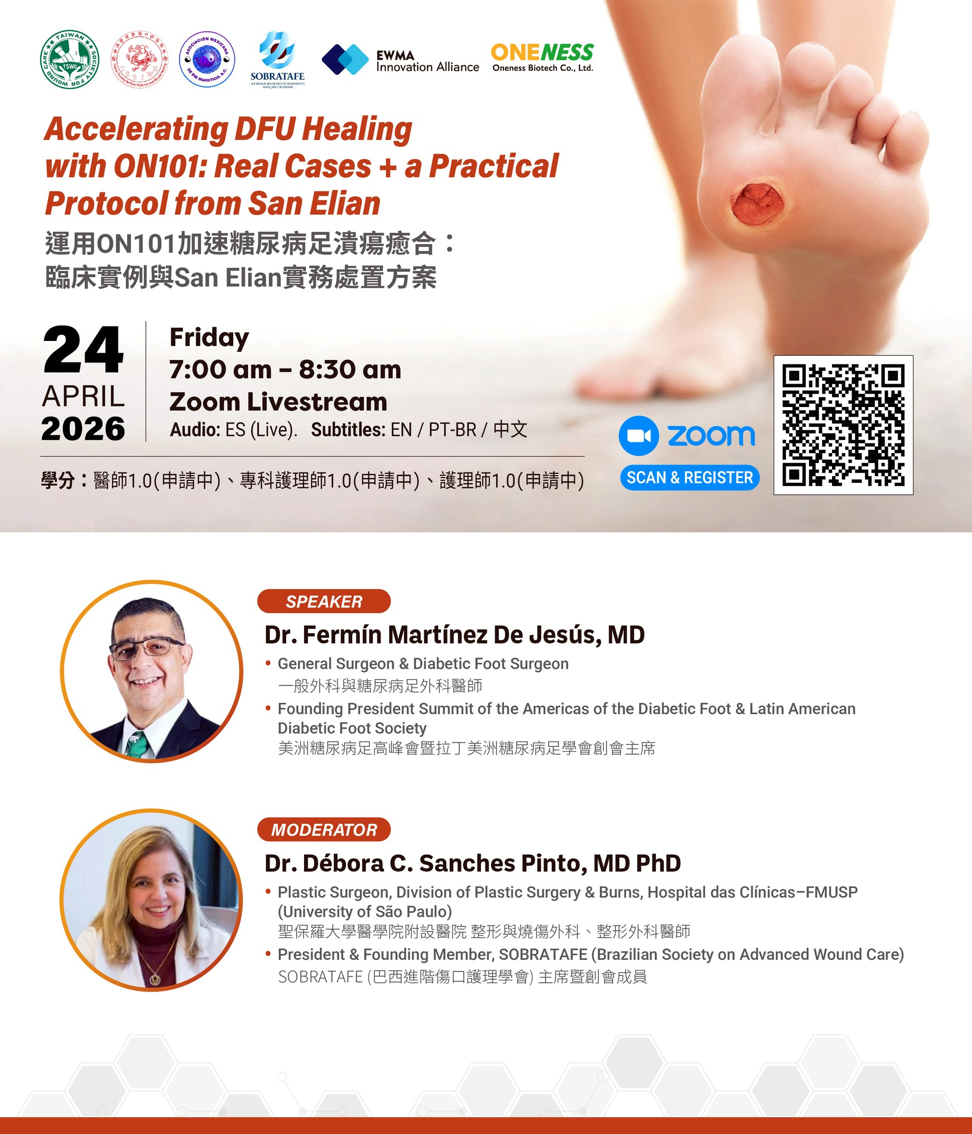 本課程由墨西哥 San Elian 糖尿病足專科中心 Dr. Fermín Martínez 分享臨床實務經驗。Dr. Martínez 為墨西哥糖尿病足協會與拉丁美洲糖尿病足協會創辦人及創始主席,長期推動區域糖尿病足照護發展。課程聚焦於「糖尿病足潰瘍(DFU)在常規照護下癒合停滯的臨床處置」為核心,透過多例真實病例進行 Bonvadis® (ON101)治療整合之案例分析,分享其在清創、感染控制、減壓/卸載、局部照護與追蹤節奏中的關鍵決策點與可複製流程,並呈現病例中觀察到的良好癒合表現(高比例達到癒合/明顯改善),以協助臨床提升照護效率與可操作性。