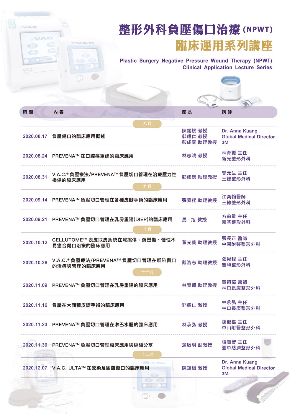 【活動公告】整形外科負壓傷口治療(NPWT)臨床運用系列講座 發佈: 2020/08/13 台灣整形外科醫學會與佑康股份有限公司於8月-12月(每週一晚上08:00-09:00)舉辦「整形外科負壓傷口治療(NPWT)臨床運用系列講座」本次課程採線上預約報名,敬請各位會、學員踴躍參加。 第一場8/17報名網址:https://register.gotowebinar.com/register/8925832504478013712** 之後場次報名網址會再於台灣整形外科醫學會網上公布 訊息連結:https://www.prsa.org.tw/news/content.php?id=341 檔案下載 FileFile size 邀請卡173 kB 議程219 kB 分類: 學會公告